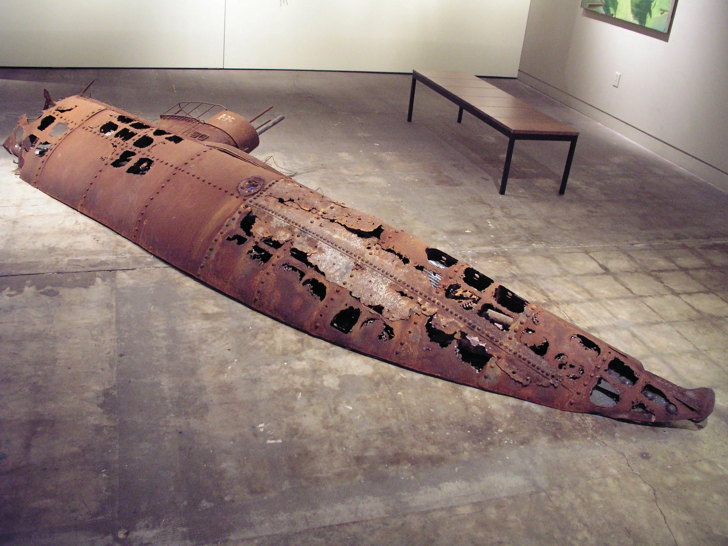 I became particularly interested in submarine wrecks after reading a book called Shadow Divers, the true story of a crew of wreck divers who discovered a sunken WW2 German U-Boat off the coast of New Jersey in the 1990s. With my version of a wrecked submarine loosely based on the design of the U-Boat I created a miniature scale all steel construction to be experienced as an installation. Titled Icarus Down, the viewer walks into the space of this wreck. In its rotting interior ghost remnants of its crew can be found along the broken hull and visible through the conning tower window is a miniature scale disheveled captains quarters. Meanwhile the hum of steam engines roar.